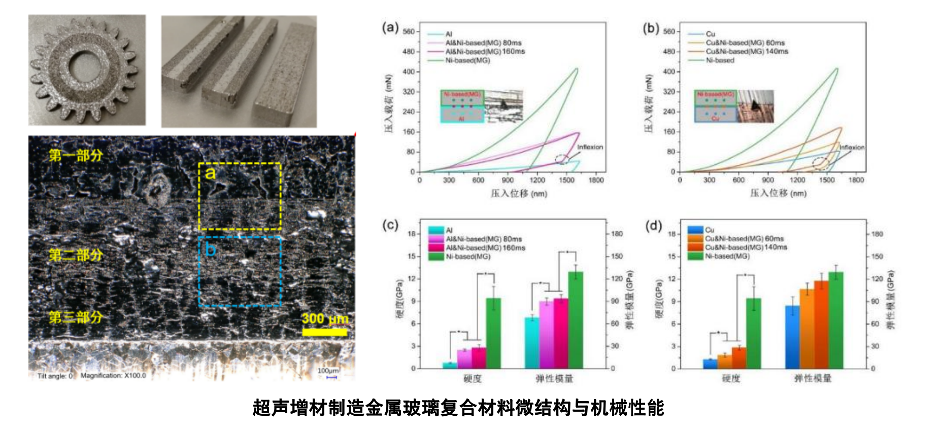 揭示了超聲與選區激光熔化增材制造成形金屬玻璃的組織演變及強化機理;提出了金屬玻璃及其與晶態金屬復合材料仿生剛柔耦合結構零件超聲增材制造方法,探究了晶態金屬仿貝殼、蜂窩等結構超聲增材制造成形,實現了高非晶率金屬玻璃可控制備。
