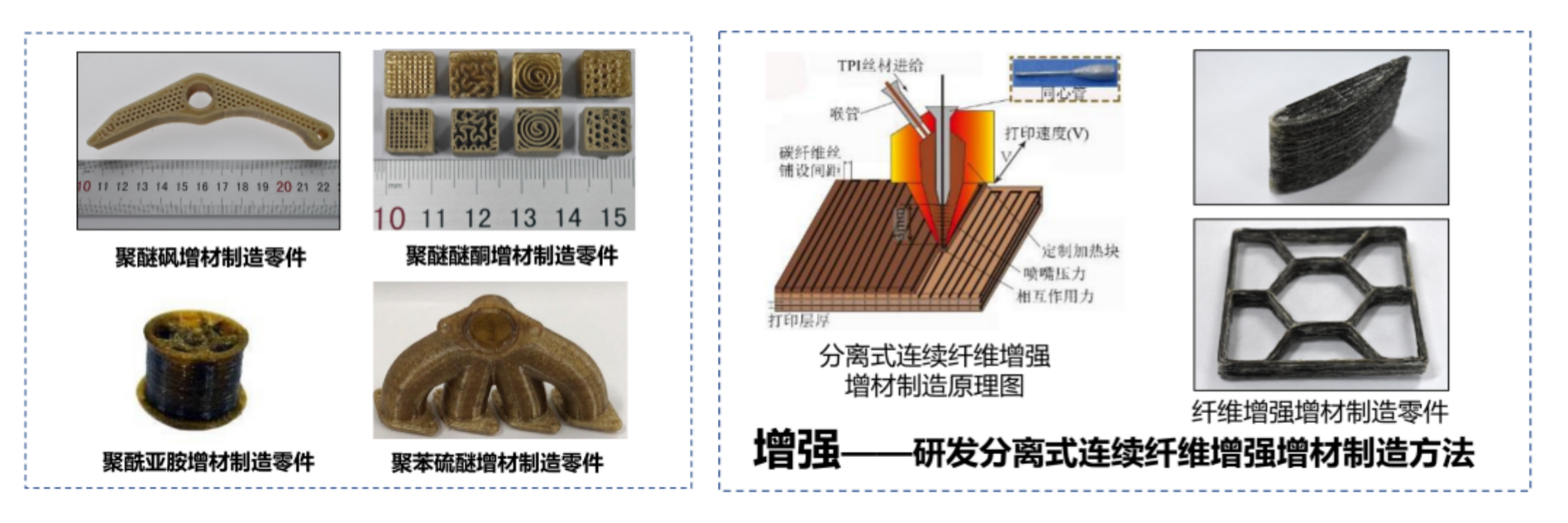 研發了高性能難成形特種工程塑料的增材制造方法與設備,揭示了高性能特種工程塑料增材制造的成形機理,實現了多種高性能特種工程塑料的增材制造,提出纖維/碳納米管增強高性能特種工程塑料增材制造策略,實現高性能特種工程塑料增強改性增材制造,為其在汽車、航空航天醫療等領域的廣泛深入應用提供了新的技術支持。