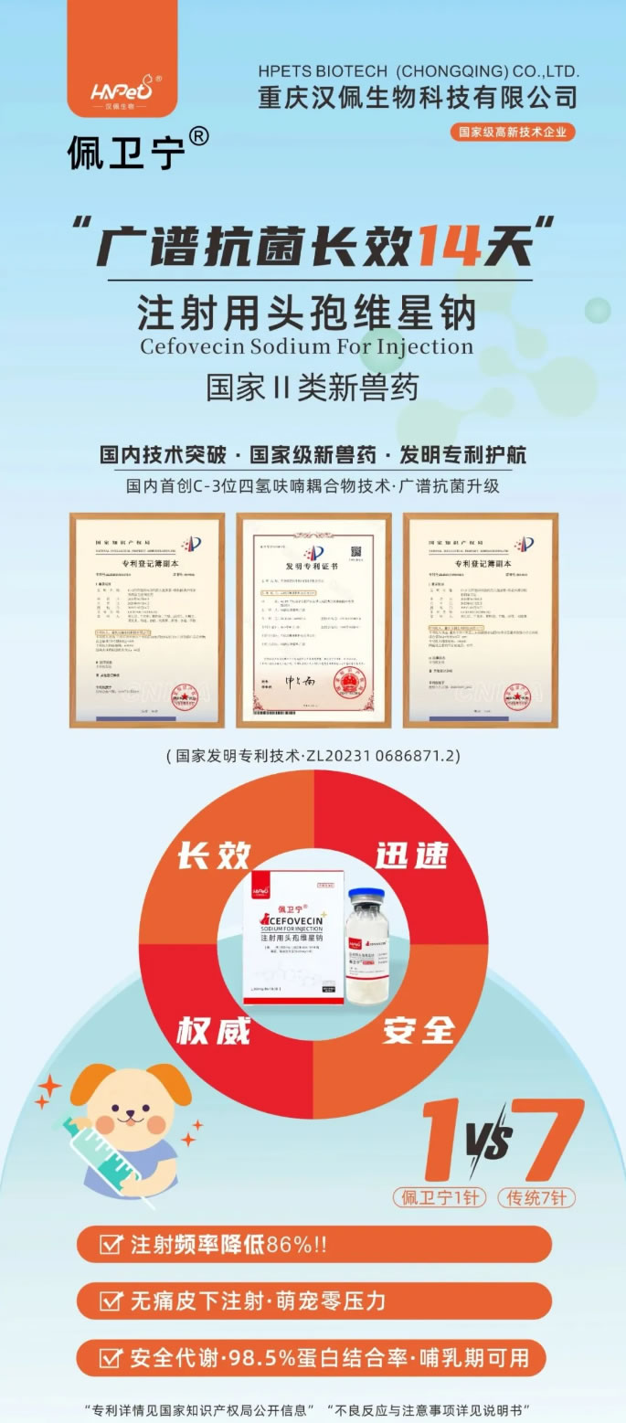 2025年1月,漢佩生物與溫氏大華農(nóng)合作的“注射用頭孢維星鈉”正式獲得國家農(nóng)村農(nóng)業(yè)部頒布的國家二類新獸藥證書。漢佩生物自建頭孢維星鈉關(guān)鍵原料藥中間體的生產(chǎn)基地,完善產(chǎn)業(yè)鏈布局,將極大地降低生產(chǎn)成本,降低終端售價。